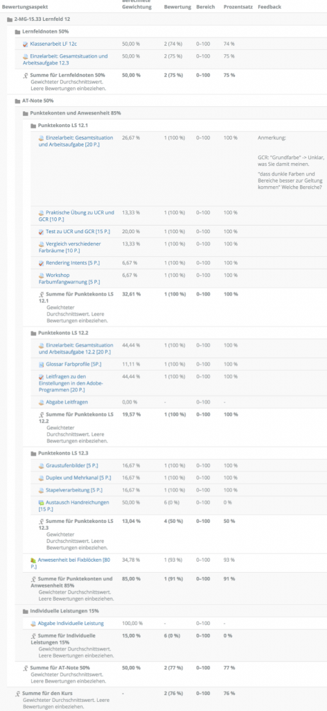 Zu Beginn unserer Arbeit setzten wir auf „Punktekonten“, eine digitale Form von Lernpfaden, bei denen Schüler:innen verschiedene Aufgaben in beliebiger Reihenfolge bearbeiten konnten. Auf unserer digitalen Lernplattform Moodle wurden Kurse bereitgestellt, die Lernmaterialien und Aufgaben enthielten. Um den Lernprozess zu strukturieren, nutzten wir Funktionen wie den „Aktivitätsabschluss“ und „Voraussetzungen“. Diese ermöglichten es, bestimmte Aufgaben erst nach Abschluss anderer freizuschalten und somit Lernpfade abzubilden.